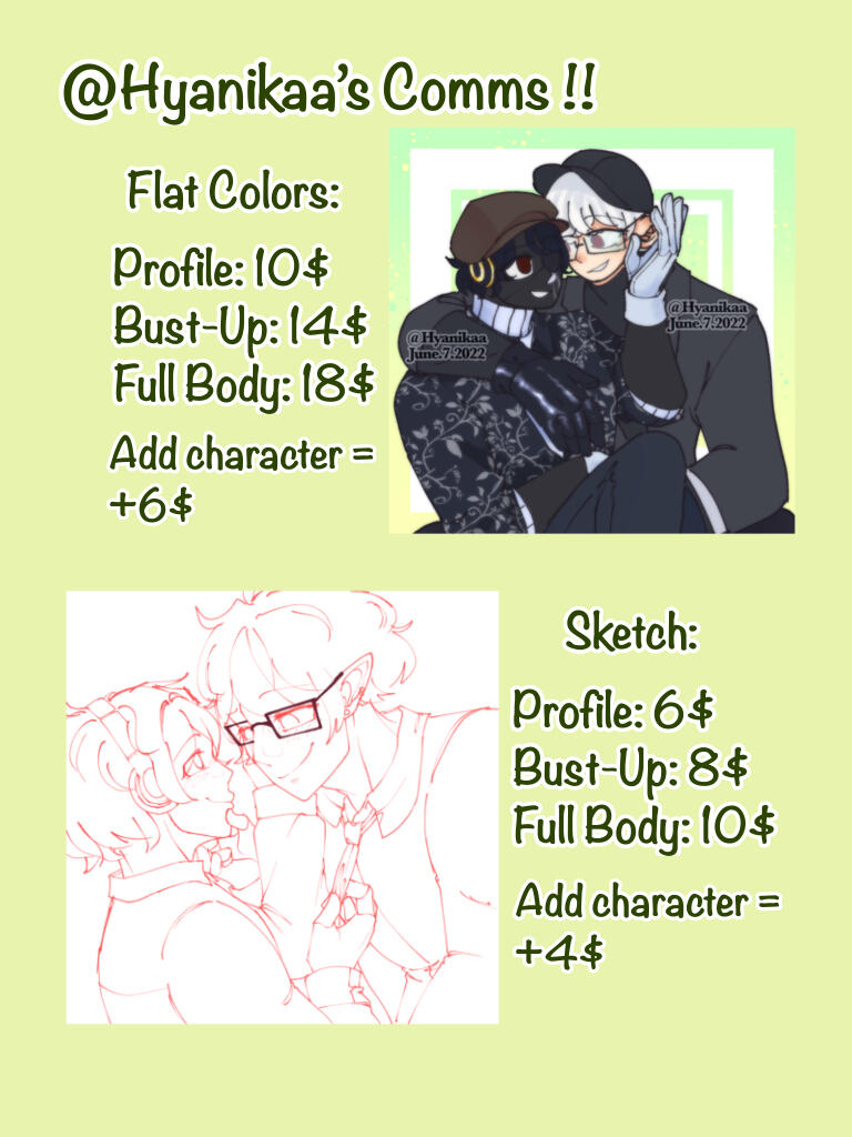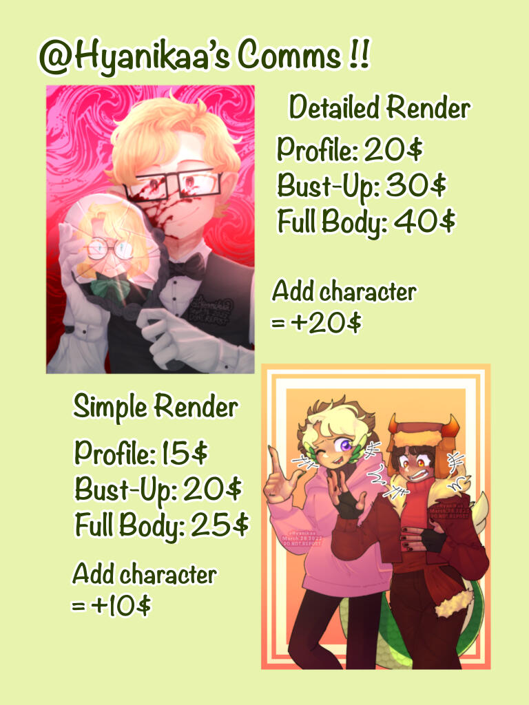 - Characters from problematic origins- - -• I will take 2 days to at least 3 weeks to finish your commission so pleas be patient.• I will send the finished piece via Email or Discord.• If you don’t specify what pose the character is doing, I will draw it in an A pose. You’re not allowed to ask me to change it once you receive it, so be specific.• Ask permission if you want to use the commissioned piece for commercial uses.• Don’t turn my commissions into NTFs!!
